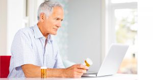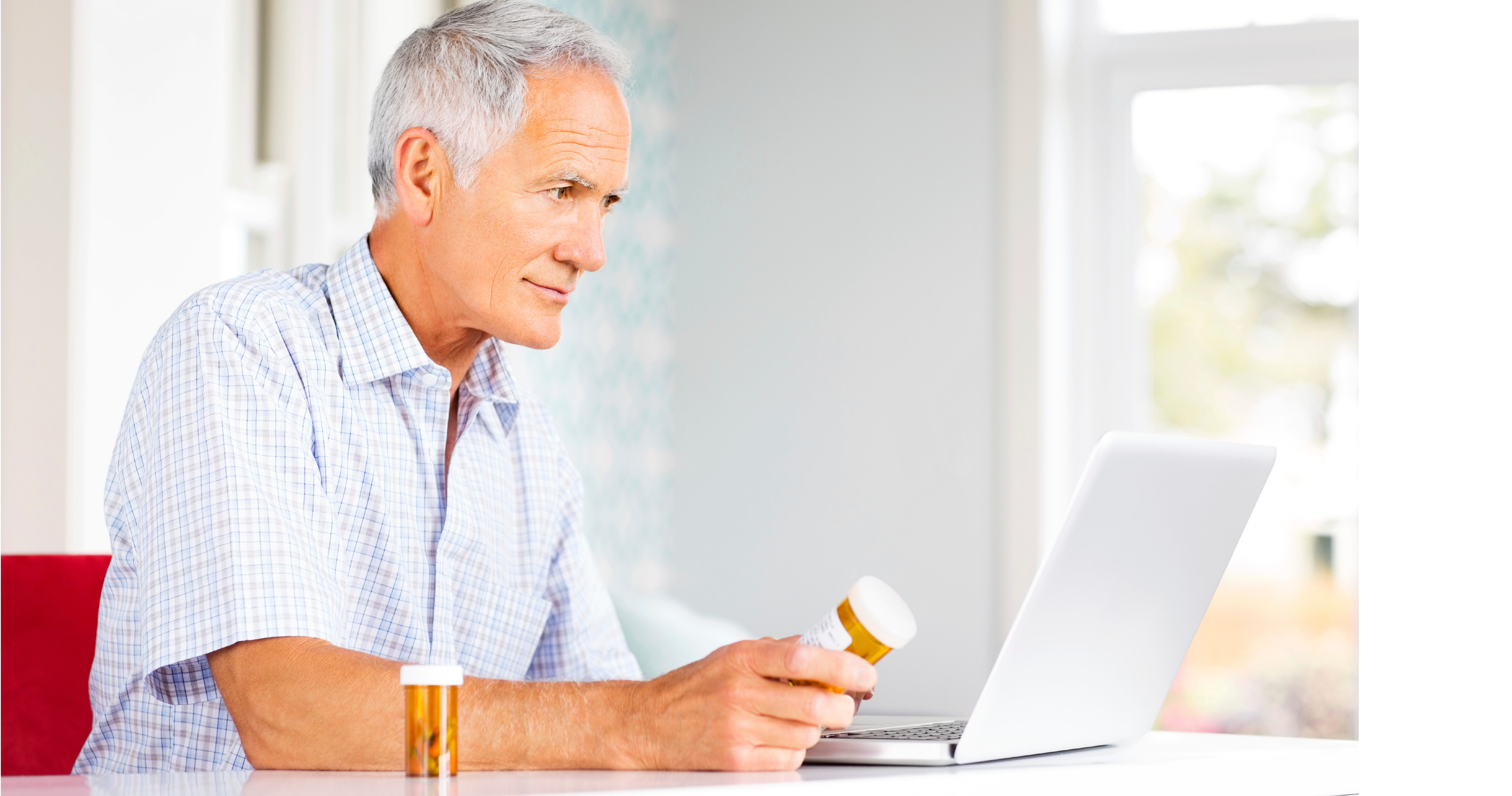 Senior man with pill bottles using laptop at home. Horizontal shot.