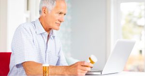 Senior man with pill bottles using laptop at home. Horizontal shot.