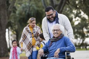 Three generation Hispanic family taking walk